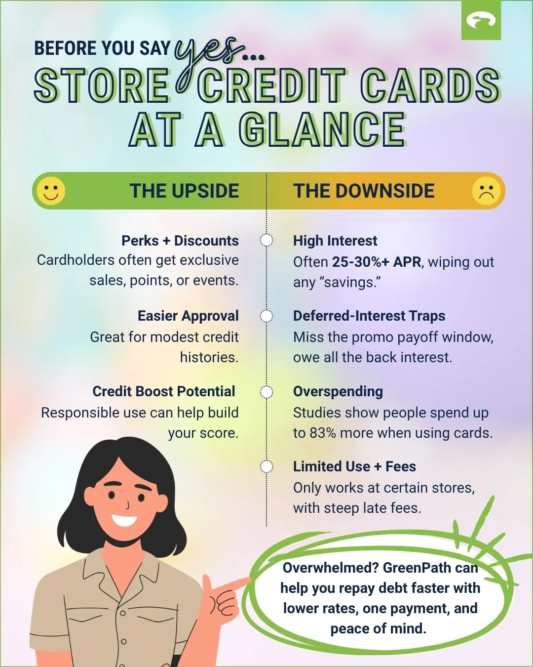 If store card debt starts piling up, you don’t have to manage it alone. GreenPath provides free financial counselingfree financial counseling and a Debt Management Program (DMP)Debt Management Program (DMP) designed to help you pay off unsecured debt in 3–5 years, with lower interest rates and consolidated payments. On average, DMP clients spend $199 less in monthly payments and pay off debt seven years sooner.
